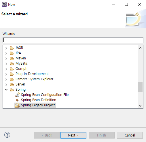 2. Spring Legacy Project를 클릭한 후 Next를 누른다.