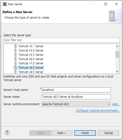 7. 원하는 Tomcat server 버전을 클릭 후 Finish를 클릭한다.