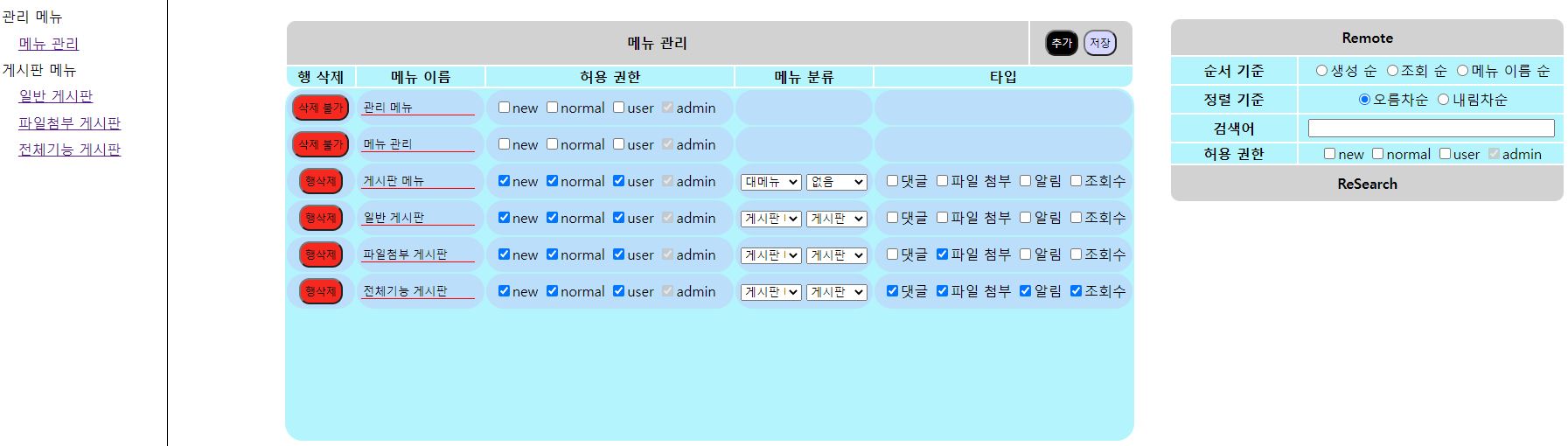 5. 메뉴관리 - 다중 행 추가/수정/삭제 가능, 권한에 따른 사용여부 조정